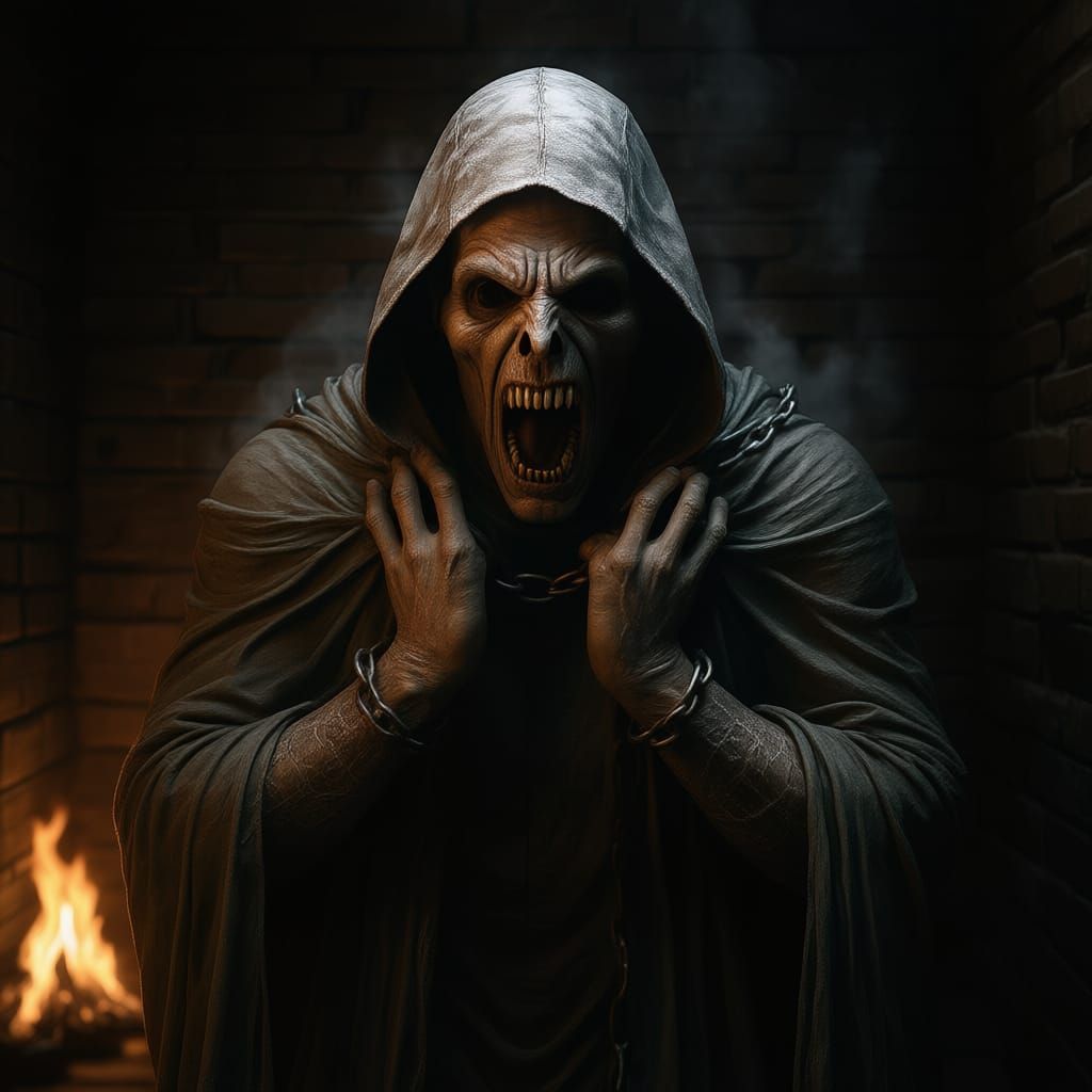This image shows a powerful, white-haired immortal deity breaking free from chains in a dark, torchlit cell. Captured with professional photography, it emphasizes intense fury and impending escape.