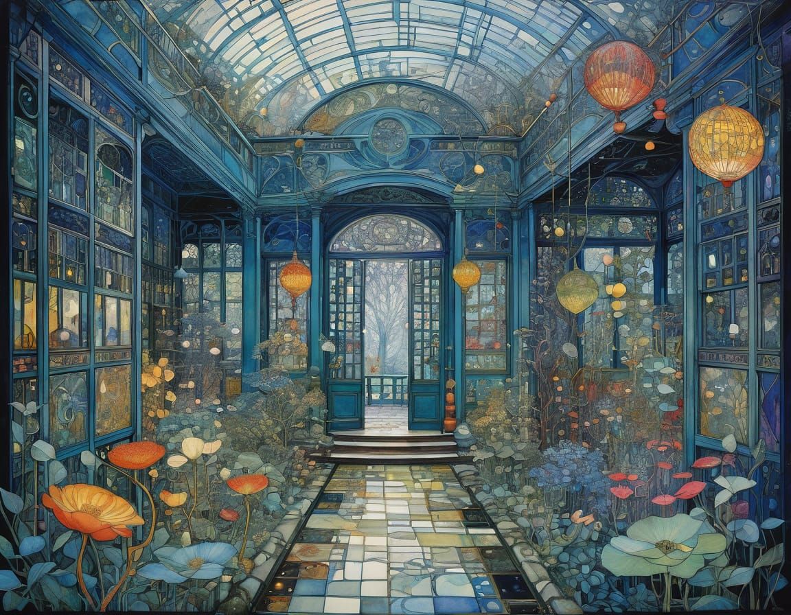 This detailed image showcases a winter garden with intricate, entangled elements, rendered in vibrant triadic colors with meticulous detail.
