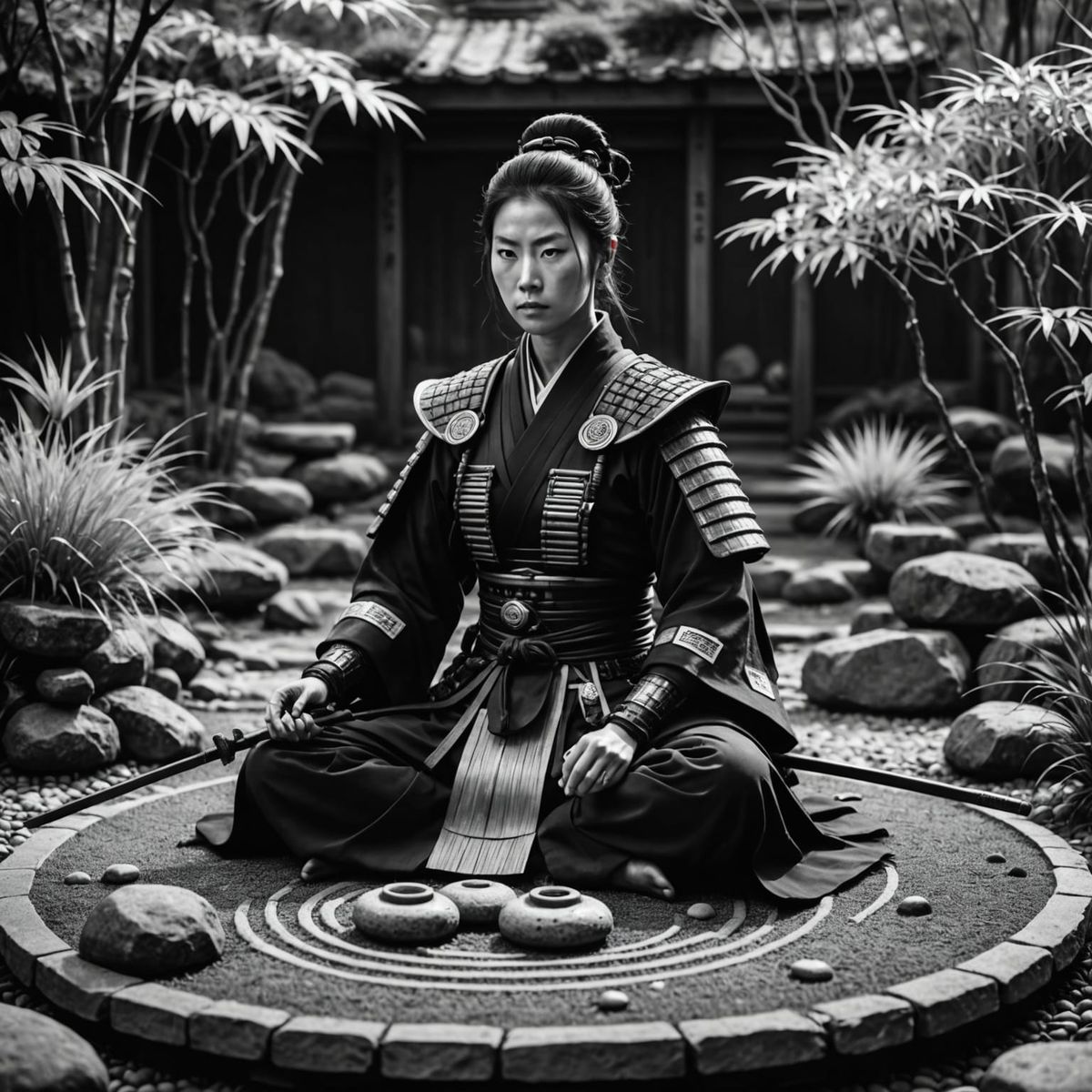 A female samurai meditating in a Zen garden, adorned with cybernetic implants and holding plasma-edged weapons. Monochrome, extreme detail, high resolution, professional photography, dramatic lighting, 8k, masterful composition, intricate details, high contrast black and white, cinematic. Background: A serene rock garden with floating meditation platforms and tall grasses softly surrounding the area."