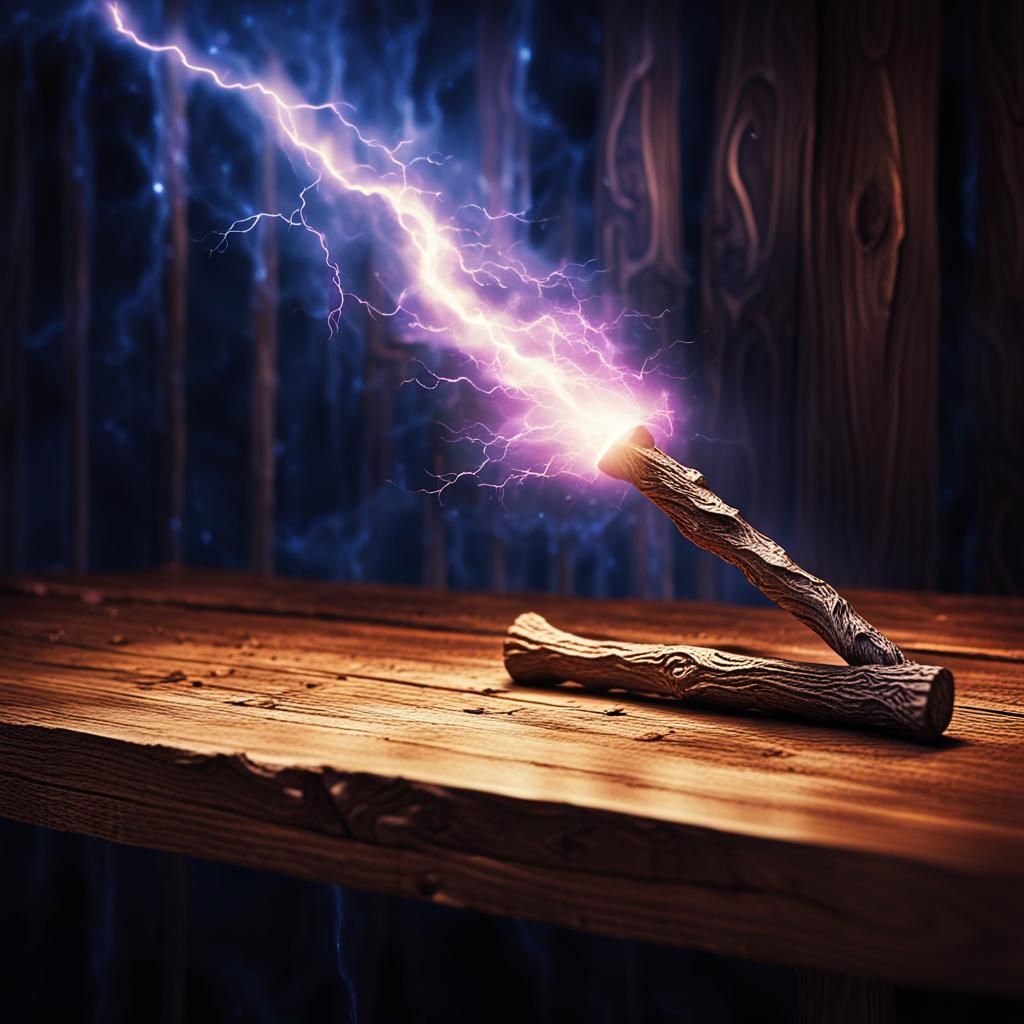 A striking picture of a wizard's wand on a wooden table, emanating magical energy. The image features dramatic lighting, crackling electricity, and a dark fantasy aesthetic.