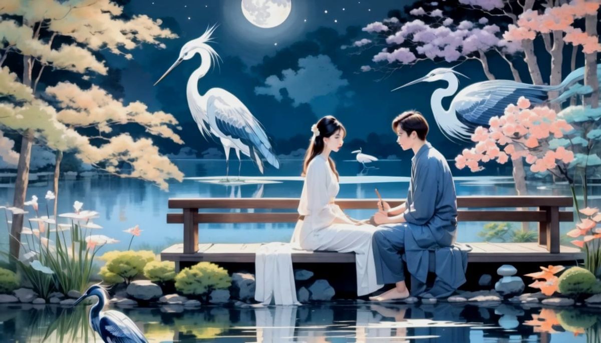 This image shows a couple on a bench at night, admiring a Japanese Zen garden with a koi pond and herons. The artwork is rendered in soft pastel colors.