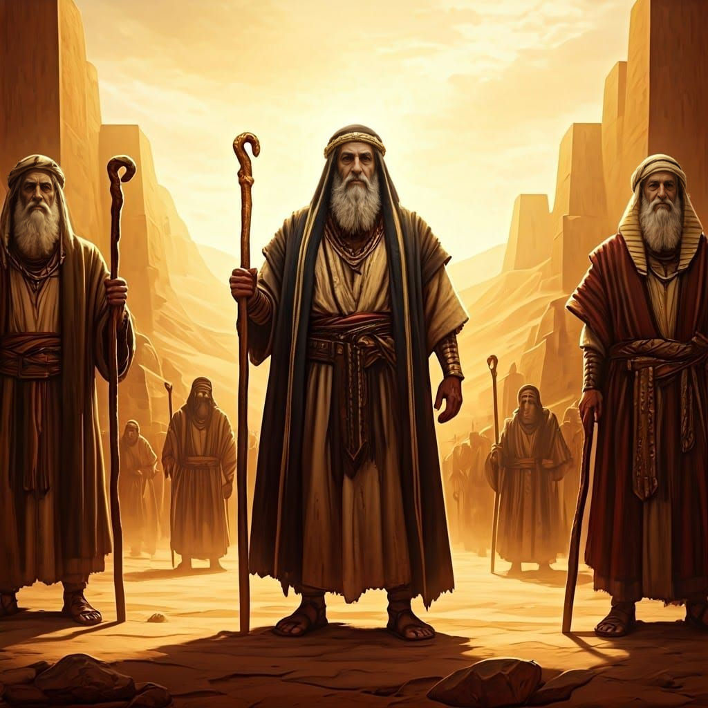This epic scene depicts a nostalgic portrayal of the Israelites as sons of Horus, fleeing Egypt in traditional attire, staffs in hand, set against a vibrant, golden-hued desert landscape, reminiscent of classic fantasy concept art with intricate details and deep colors.