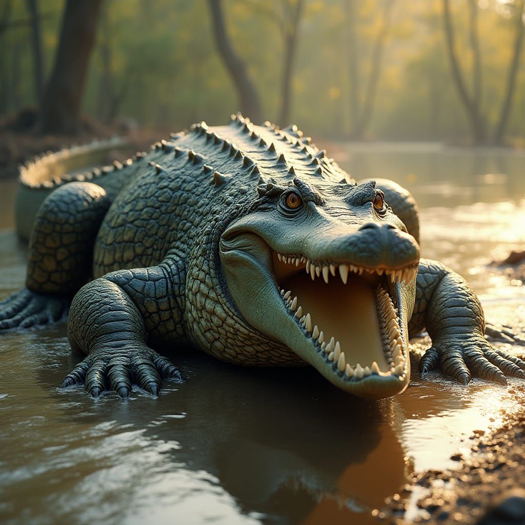This image depicts a massive, realistic crocodile-alligator hybrid, its powerful jaws agape, resting on the riverbank. The warm sunlight casts a golden glow on its rough, armored hide, highlighting its sharp claws and scaly texture.
