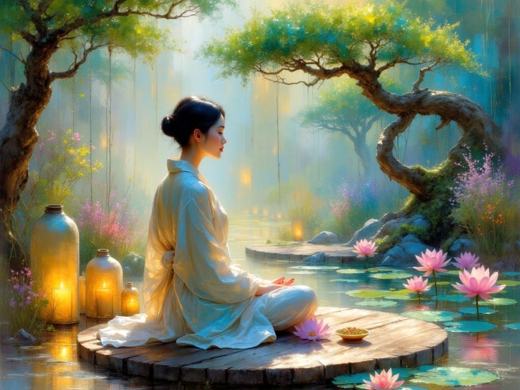 This image shows a serene Japanese model with a pixie cut meditating in an illuminated space. The scene is an oil painting with iridescent colors, bonsai trees, and lotus flowers in a fantasy setting.