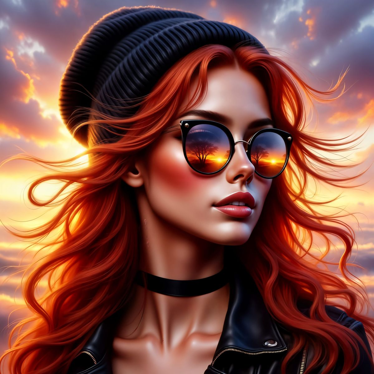 This image is a beautiful oil painting in soft impressionist style, featuring a stunning Ethereanime character with long, flowing red hair and delicate features. She wears a black beanie and sunglasses, set against a dreamy sunset background with warm, natural light and scattered sparkles.
