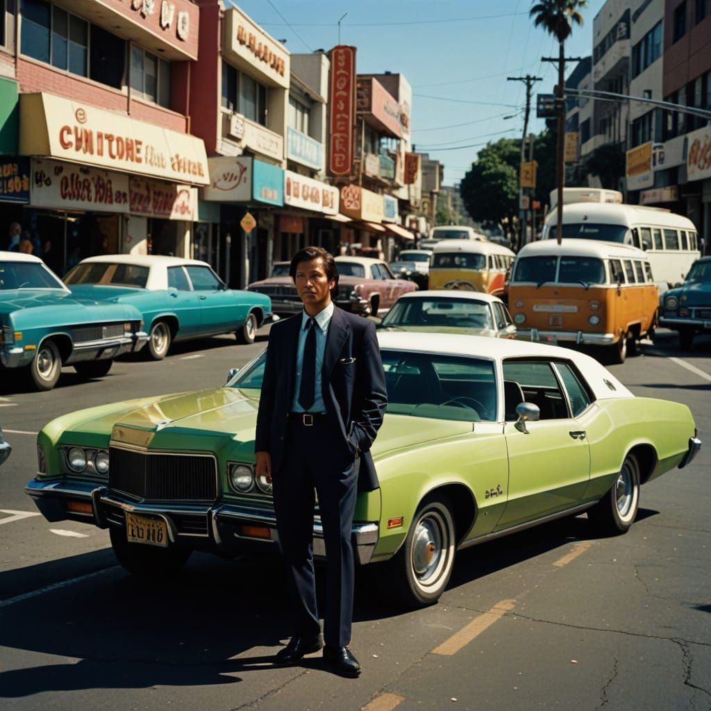 This image shows a detective striking a pose against a classic 1972 Buick Riviera against a neon-lit Los Angeles backdrop. The digital art evokes a vintage crime aesthetic.