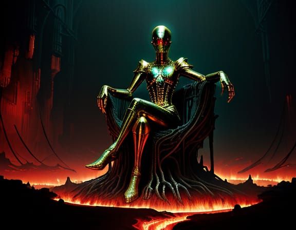 This image depicts a surreal scene of a woman in a gold mine, illuminated by glowing embers and golden hour light. The style is atmospheric and haunting, reminiscent of dark fantasy art.