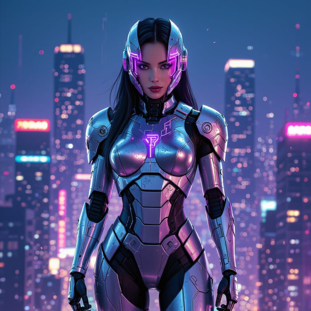 This image shows a heroic female robot with silver armor and purple highlights standing in a bold pose. The robot has glowing circuit tattoos and is set against a cyberpunk cityscape.