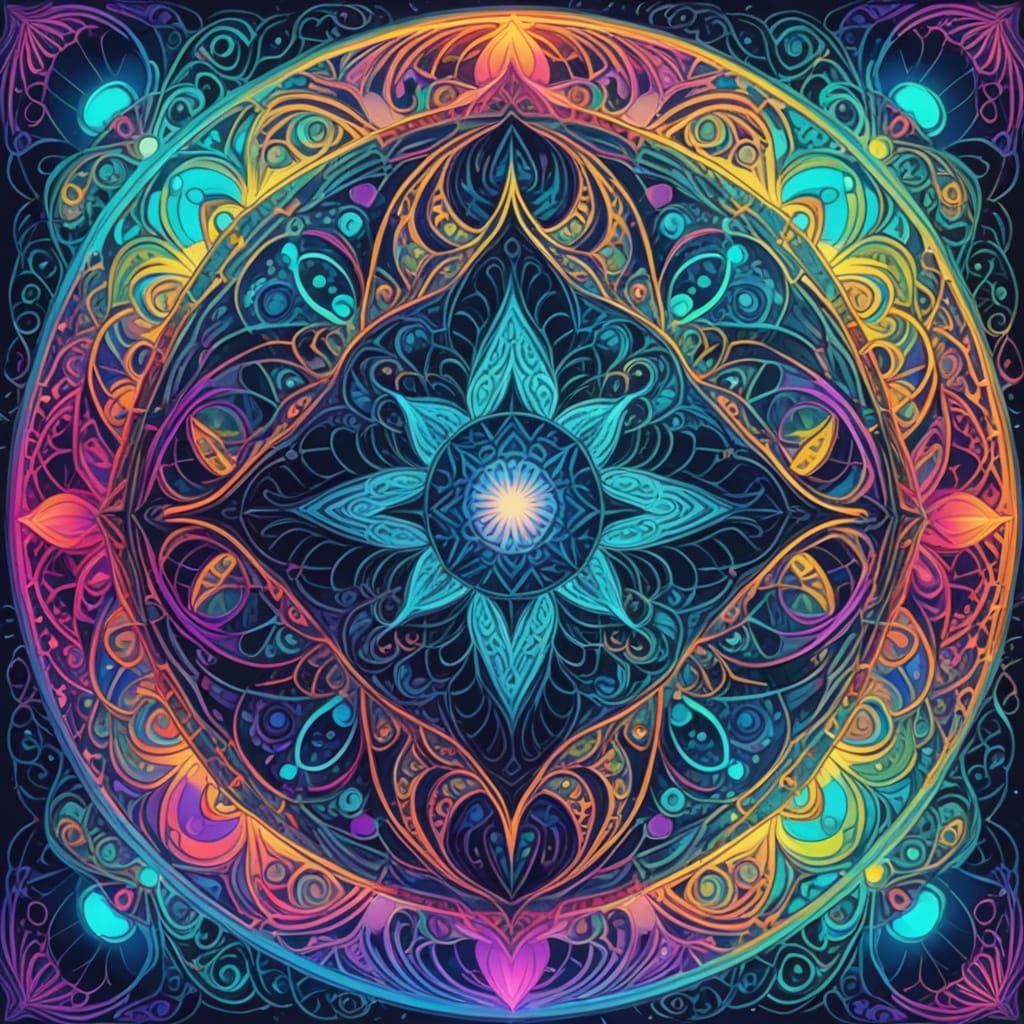 This mesmerizing image showcases an Easter egg surrounded by a shimmering aura, featuring a colorful background with intricate geometric patterns, ornate line art, and detailed abstract linework, all coming together in a trippy, psychedelic display of vibrant, glowing colors.