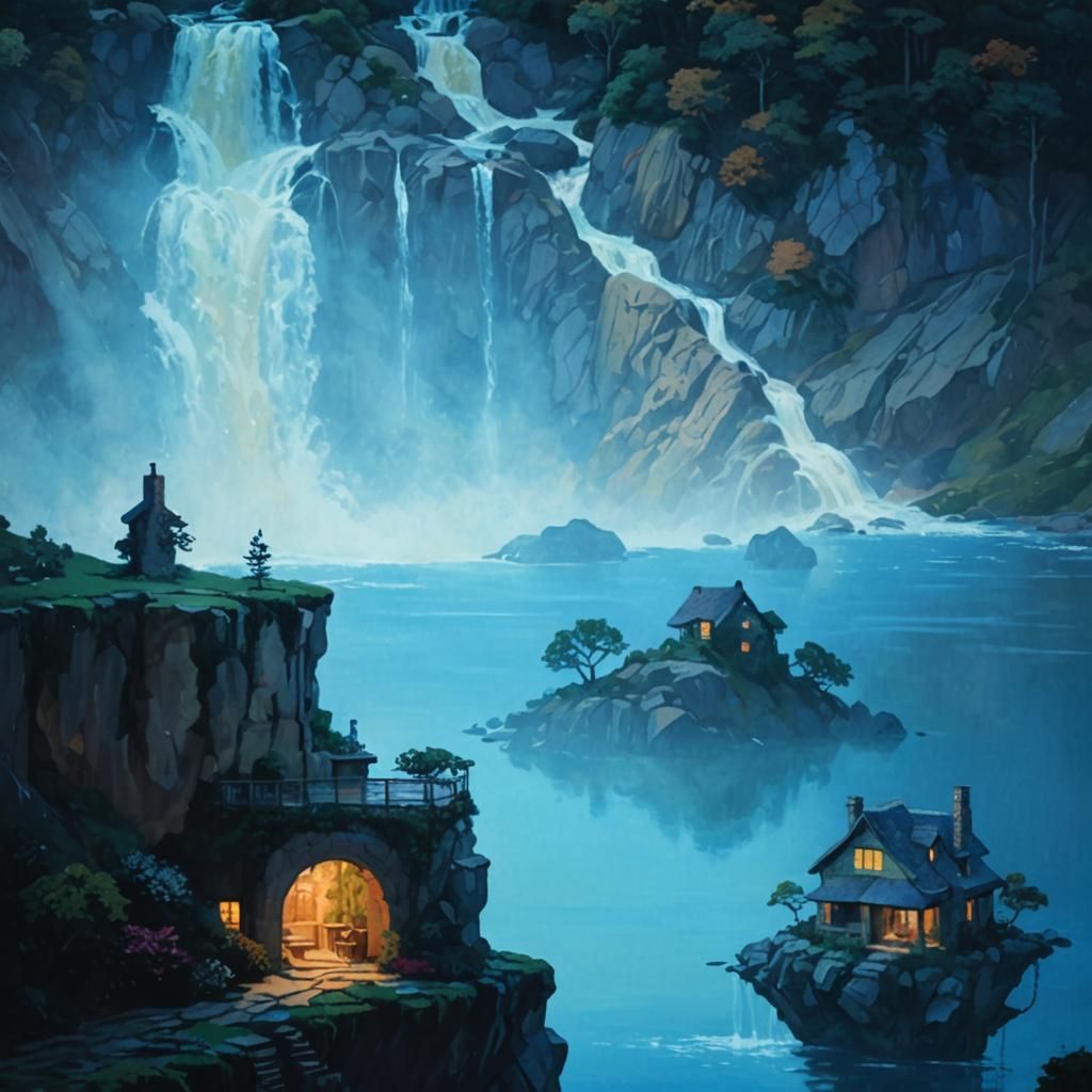 A hyperrealistic medium shot of a cliffside house overlooking a watering hole and waterfall. The image features an art deco design, a Claude Monet color palette, and golden hour lighting.