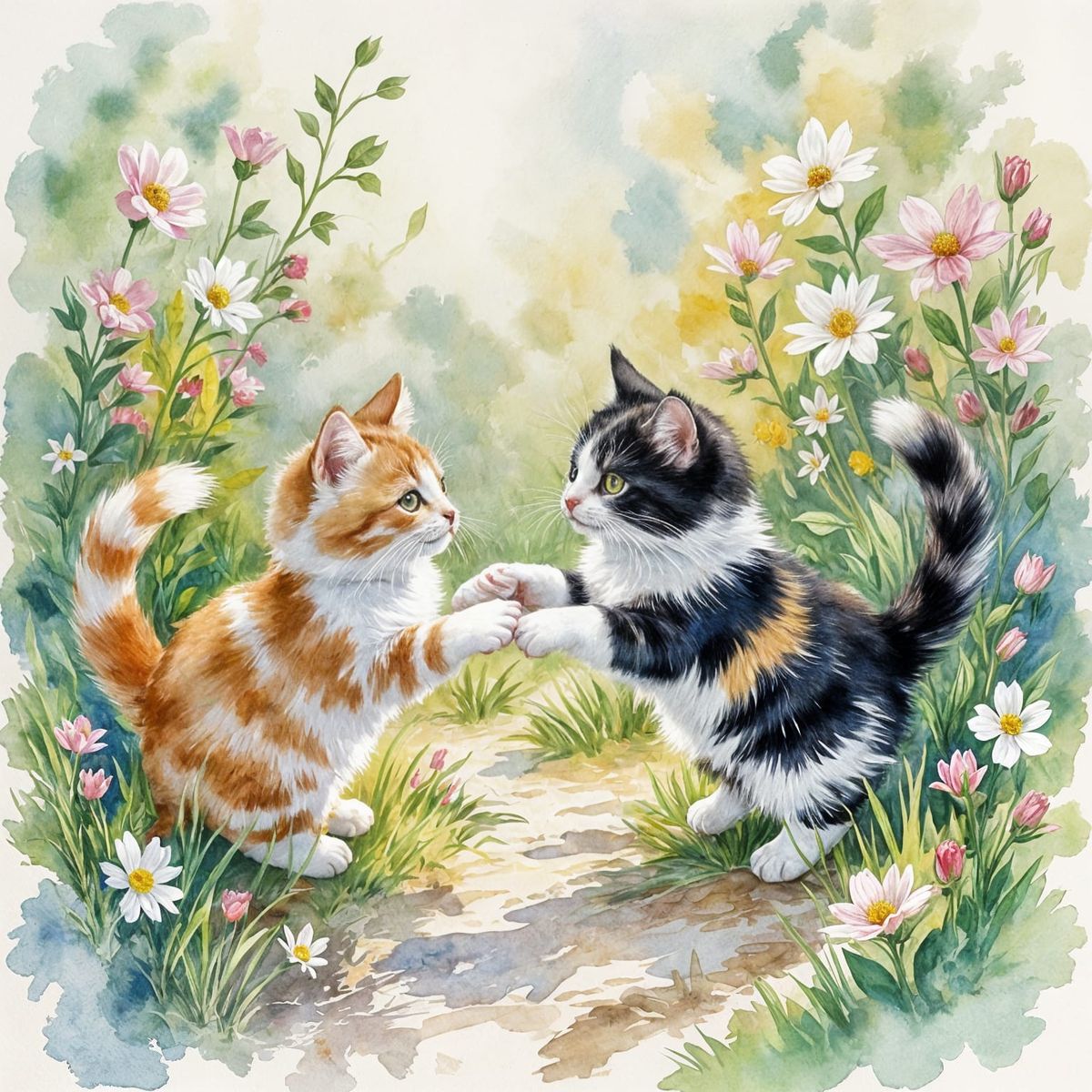 This image shows two adorable calico cats playfully chasing tails in a lush, overgrown spring garden, rendered in a textured watercolor style.