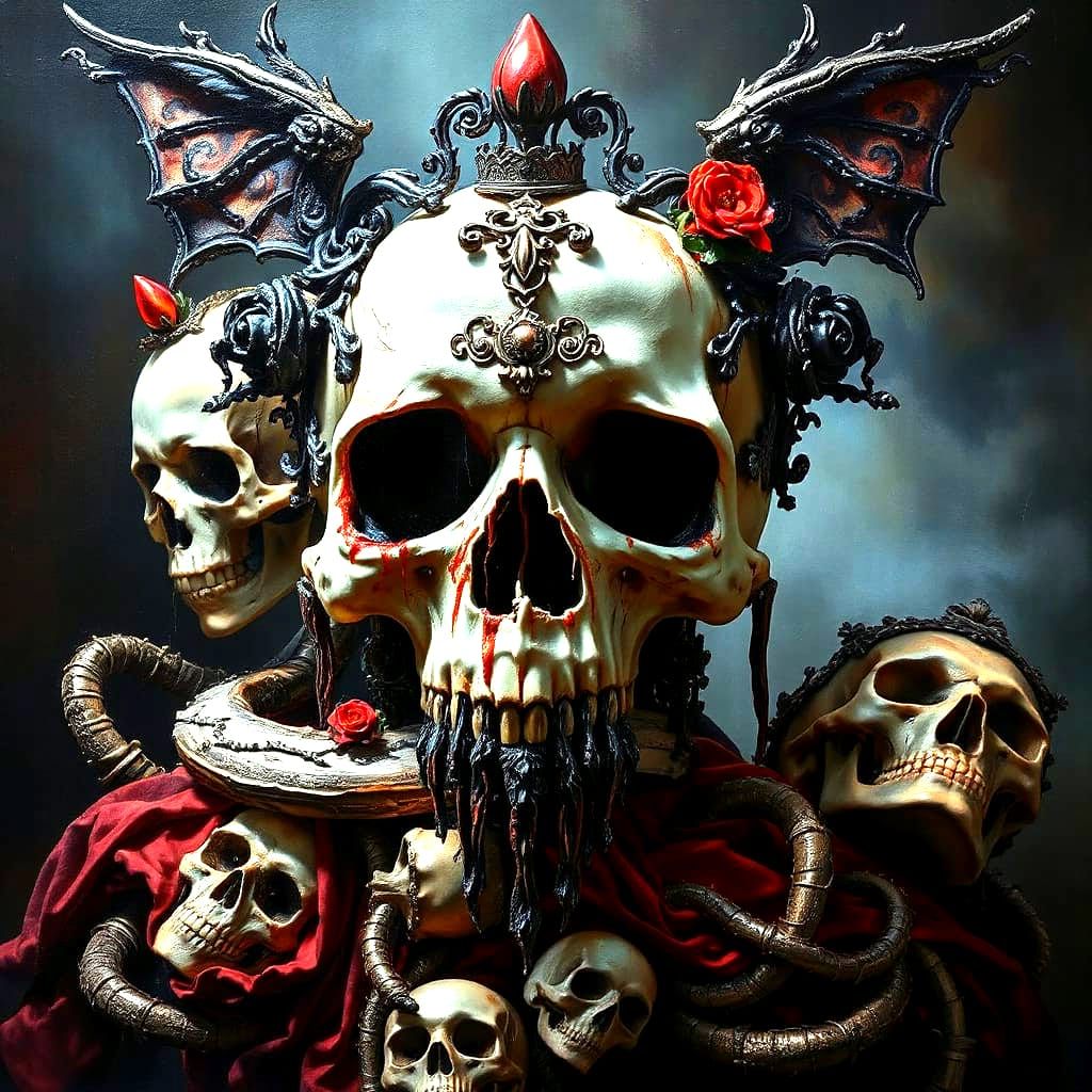 Design unique macabre human skulls with gothic details. Our free AI tool makes it easy to bring your dark fantasy visions to life.