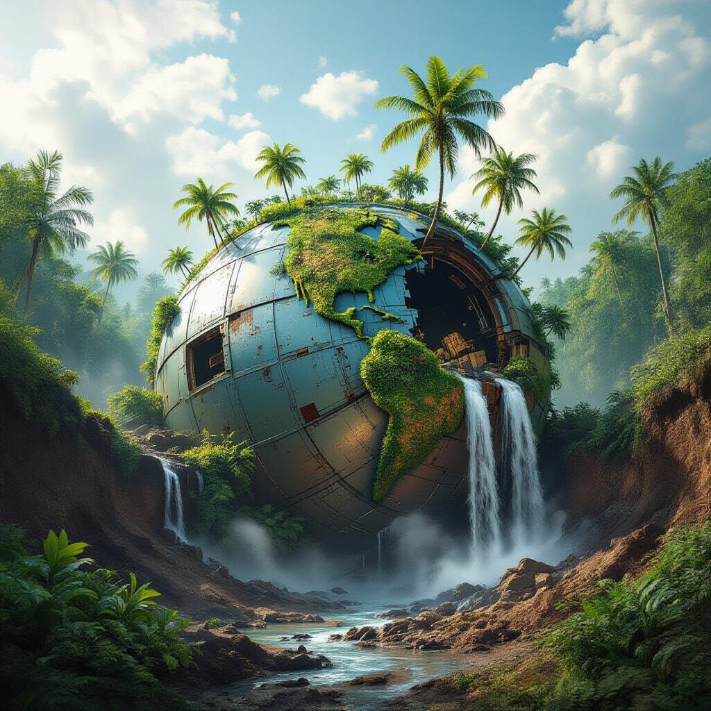 A massive crashed satellite lies half-buried in the earth, its metallic panels dented, broken, and scorched from re-entry. On top of the satellite, a lush tropical forest has taken root, bursting with vibrant greenery, towering palms, and flowering vines. Waterfalls cascade dramatically from openings and broken edges, spilling down the sides of the satellite and pooling into streams below. Mist rises where the water meets the ground, creating a surreal, otherworldly atmosphere. The contrast between the cold, decaying machine and the thriving, colorful ecosystem emphasizes rebirth and nature’s resilience. Intricate details in rusted metal, cascading water, and glowing jungle foliage, rendered in cinematic, highly detailed style with bold lighting and vibrant color palette. --ar 16:9 --v 5 --style detailed --quality 2 --style_strength 95.