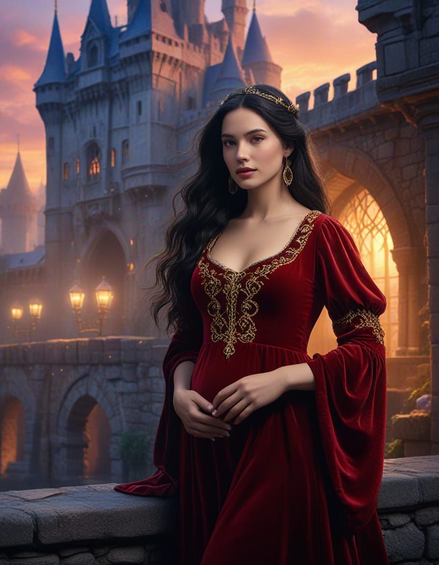 A vibrant image of a pregnant Snow White in a red velvet gown, smiling towards a castle. The digital painting showcases golden hour lighting and a dreamy, Disney-inspired fairytale realism.