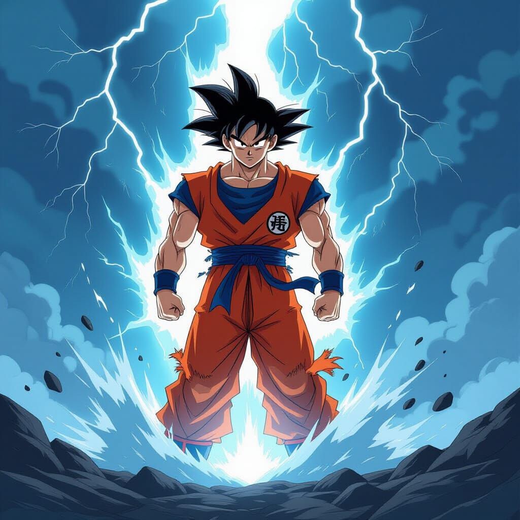 A dynamic anime-style image of Goku ready for battle. Lightning illuminates the scene as he stands amidst swirling energy. His muscular physique and determined expression convey his power.