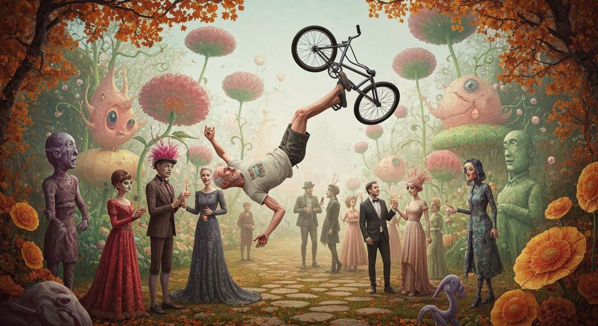 This image shows a frail, elderly man performing stunts on a BMX bike. It's a hyperrealistic rendering with intricate details and vibrant colors, blending dystopian and futuristic aesthetics to create a surreal scene.