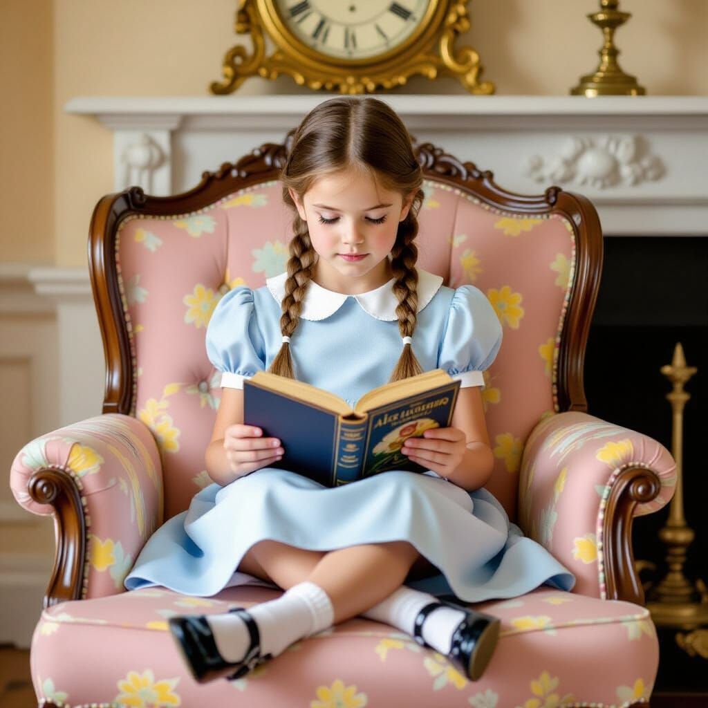 This image shows a serene 10-year-old girl engrossed in a book on a floral armchair, bathed in warm sunlight. The scene evokes a dreamy, magical fairytale illustration.