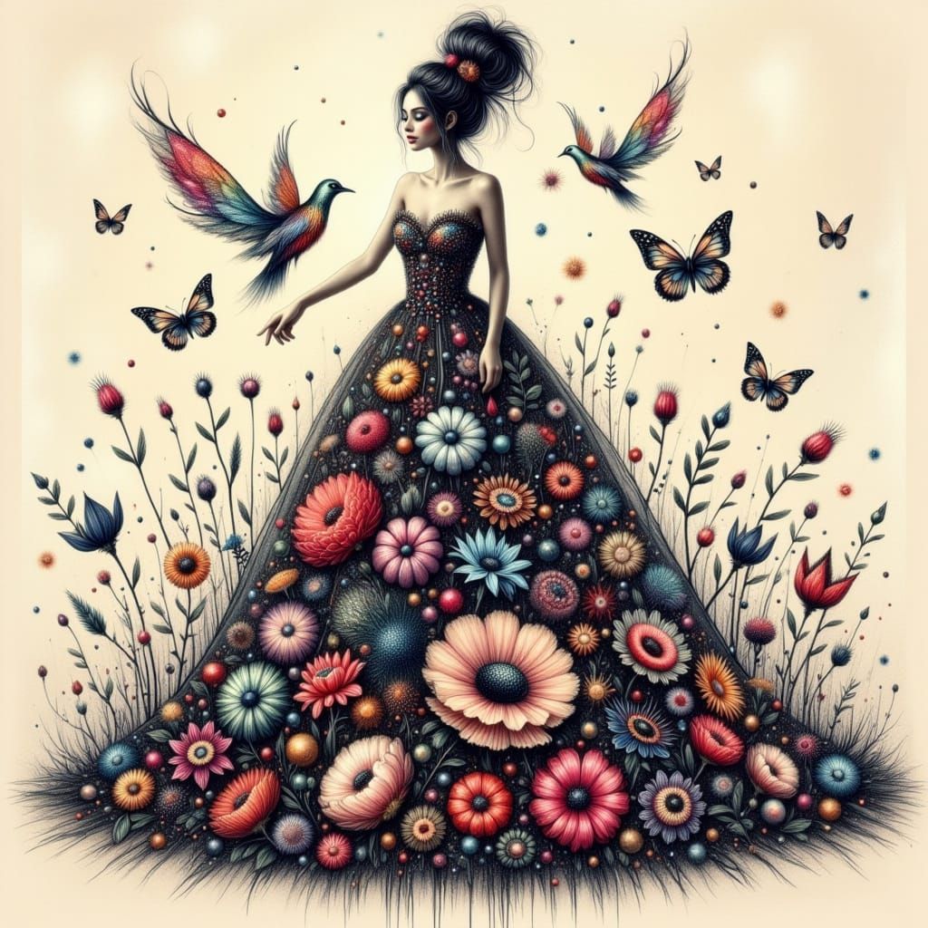 This image shows a woman in a long, flowing dress made of vibrant flowers, set against a surreal post-apocalyptic backdrop, with intricate details and a mix of modern and European art styles.