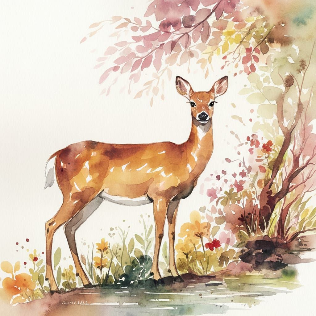 Easily generate your own deer images with a river, leaves, and flowers in a beautiful watercolor style. It's free, easy, and flexible!