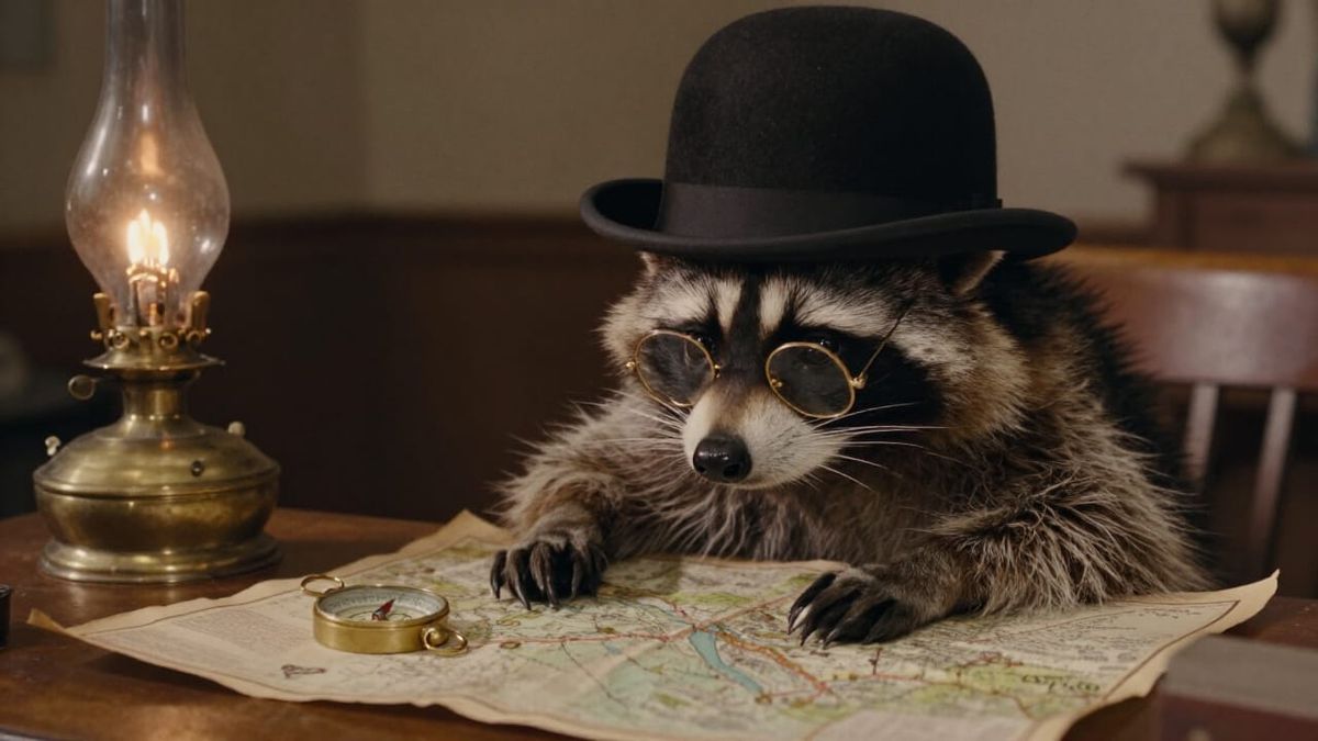 This image shows a raccoon in a bowler hat and gold glasses examining an old map. Features soft focus, film grain, and dramatic shadows, evoking a vintage aesthetic.