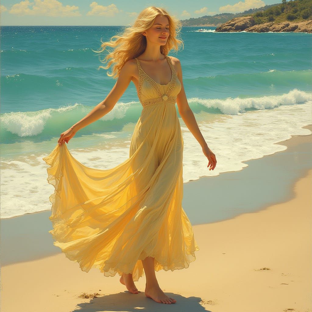 This image depicts a stylish woman with wavy blonde hair, wearing a light rainbow-colored dress, smiling as she strolls along a serene beach. The artwork is reminiscent of Art Nouveau and features delicate details and soft pastel hues.
