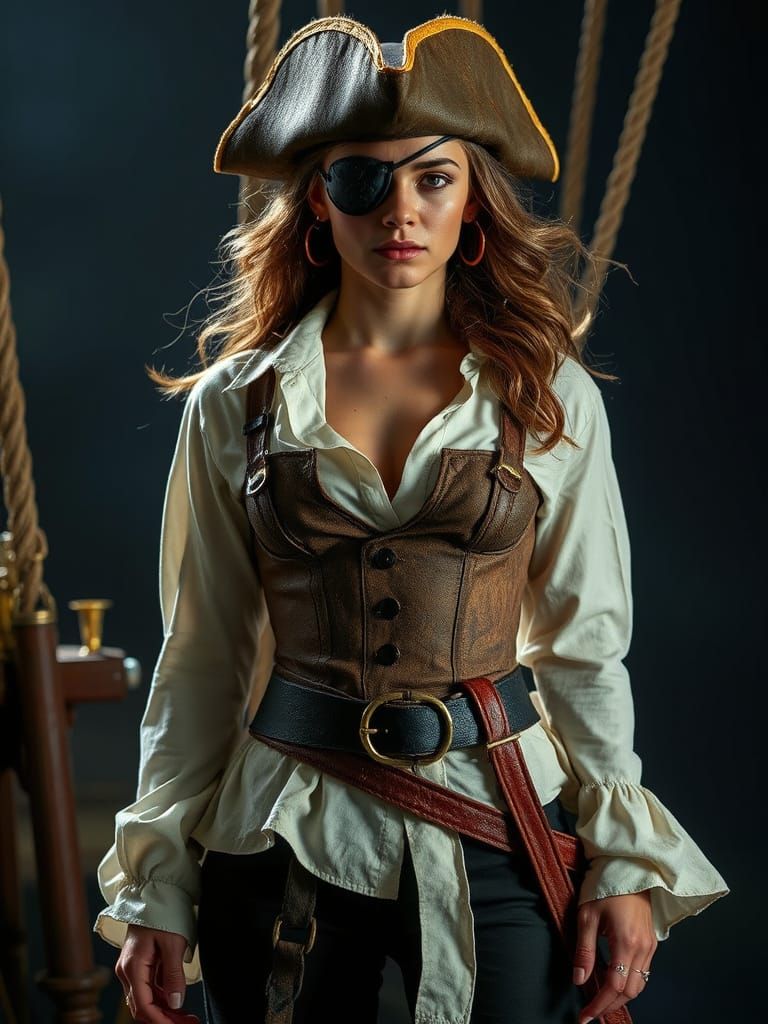 A digital matte painting of a proud pirate captain. She's wearing a white shirt, corset, tattered pants, tricorn hat, eye patch, and gold earrings. The cinematic image features dramatic lighting.