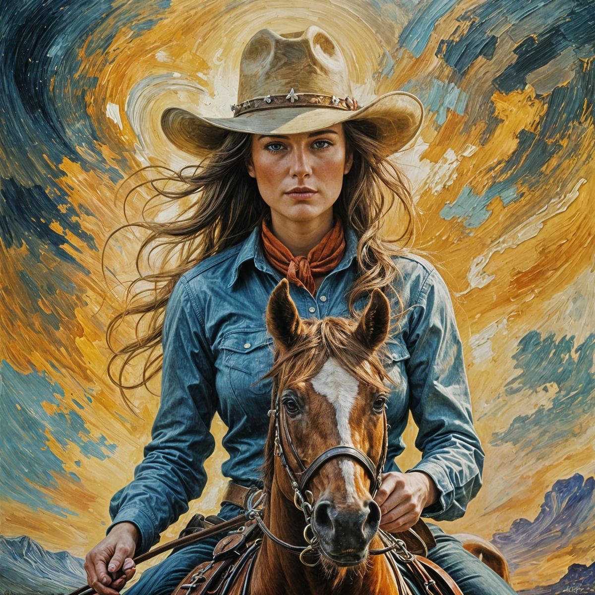 A striking picture of a cowgirl riding a horse in a storm. The artwork employs impasto techniques and a surreal, impressionistic style to create a magical, ethereal scene.