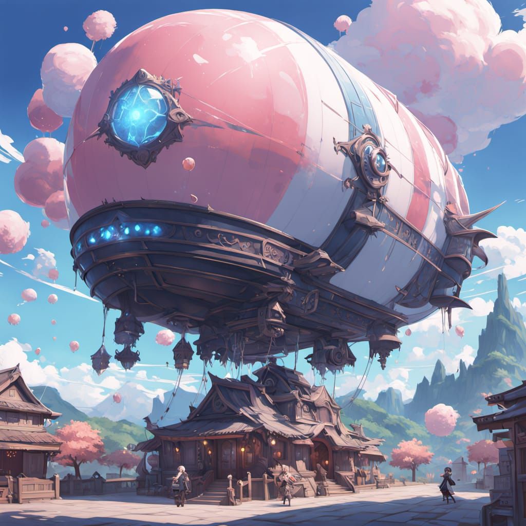 This image shows a fantasy airship shaped like a cotton candy shop, rendered in a retro-futuristic 3D anime style. The scene features pastel colors, delicate lines, and soft, warm lighting.