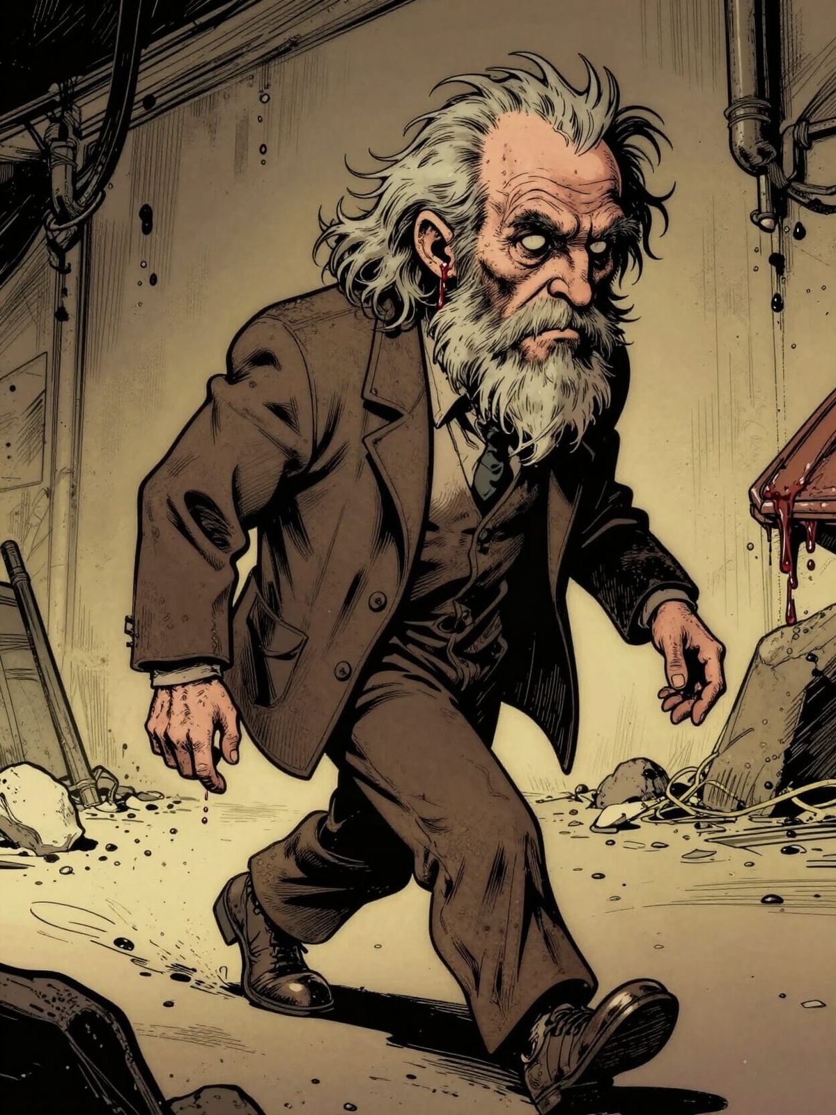 This image depicts a disheveled professor with wild hair, visibly leaving a trail of earwax. Rendered in a gritty comic style with bold lines and dynamic lighting, emphasizing a gross and unsettling scene with muted colors.