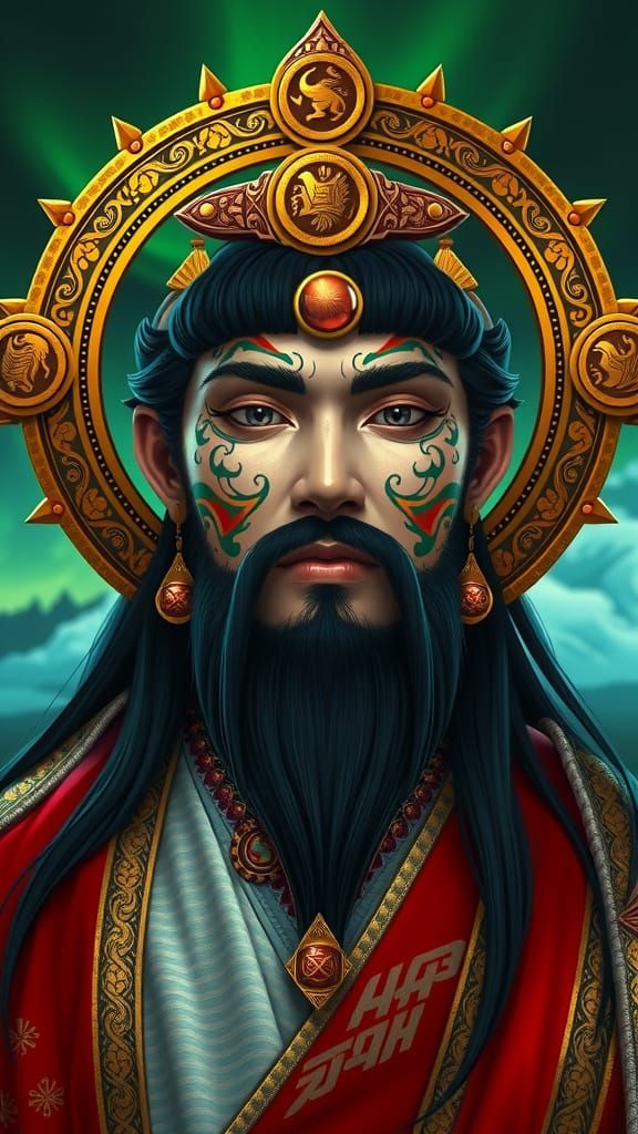 A powerful figure wears a golden headband with intricate engravings, set against a backdrop of vibrant green, black, and red hues, in a stunning Vray render.