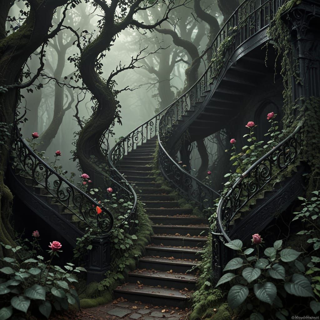 A mystical stairway ascends through an eerie eldritch forest, adorned with a dark and foreboding black rose. This haunting scene is reminiscent of dark fantasy art.