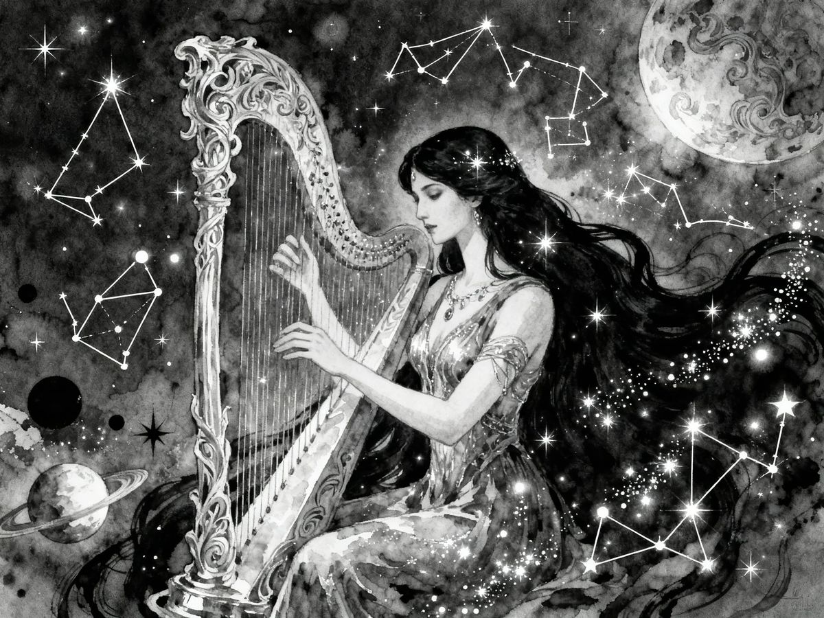 A detailed black and white illustration of a goddess with long hair playing a harp, rendered in a soft watercolor and ink style with intricate details and a sparkling aura.
