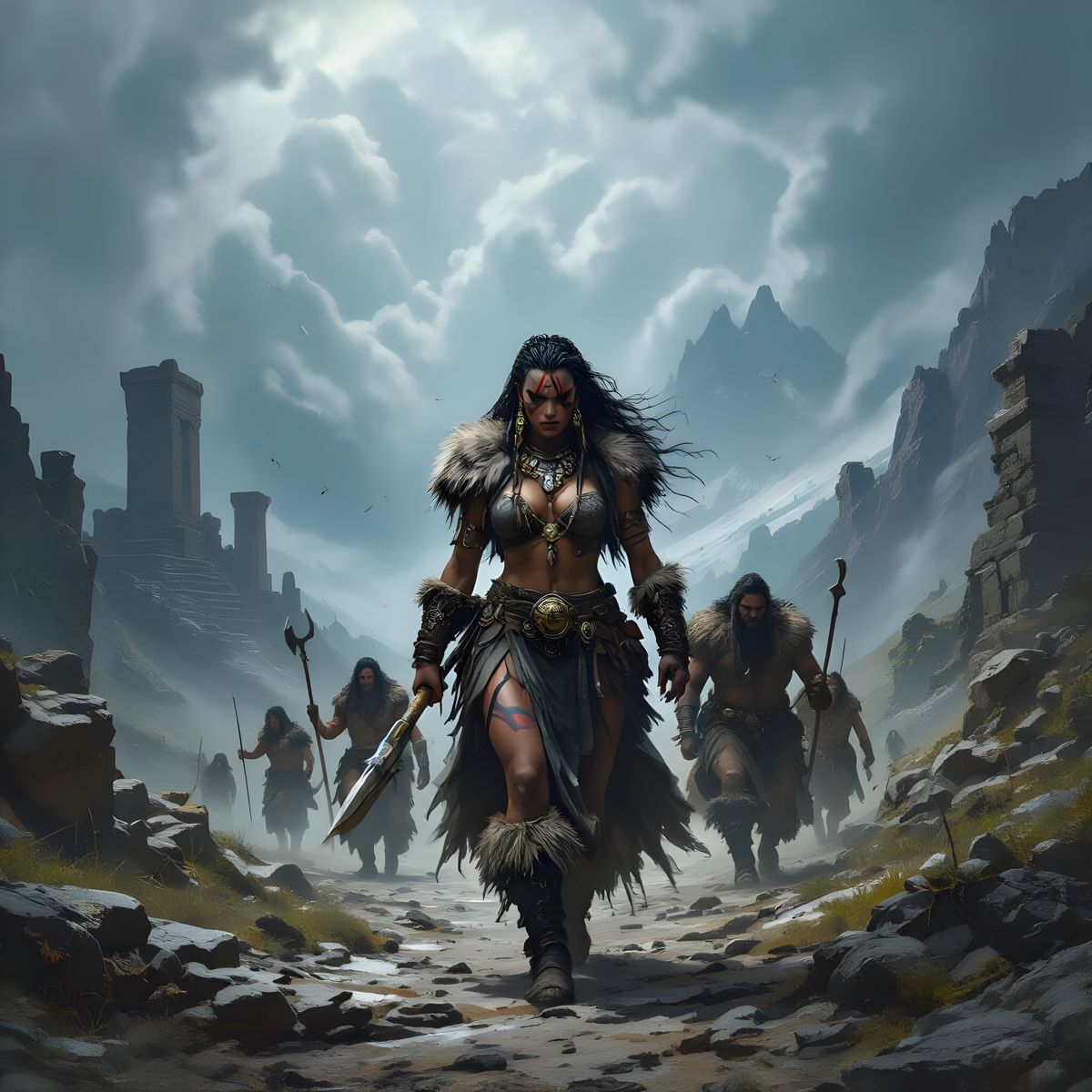 This image shows a barbarian queen leading her clan through a mountain pass, complete with tribal markings and furs. The scene is set under a stormy sky with ancient ruins, rendered in a dark fantasy style with gritty textures.