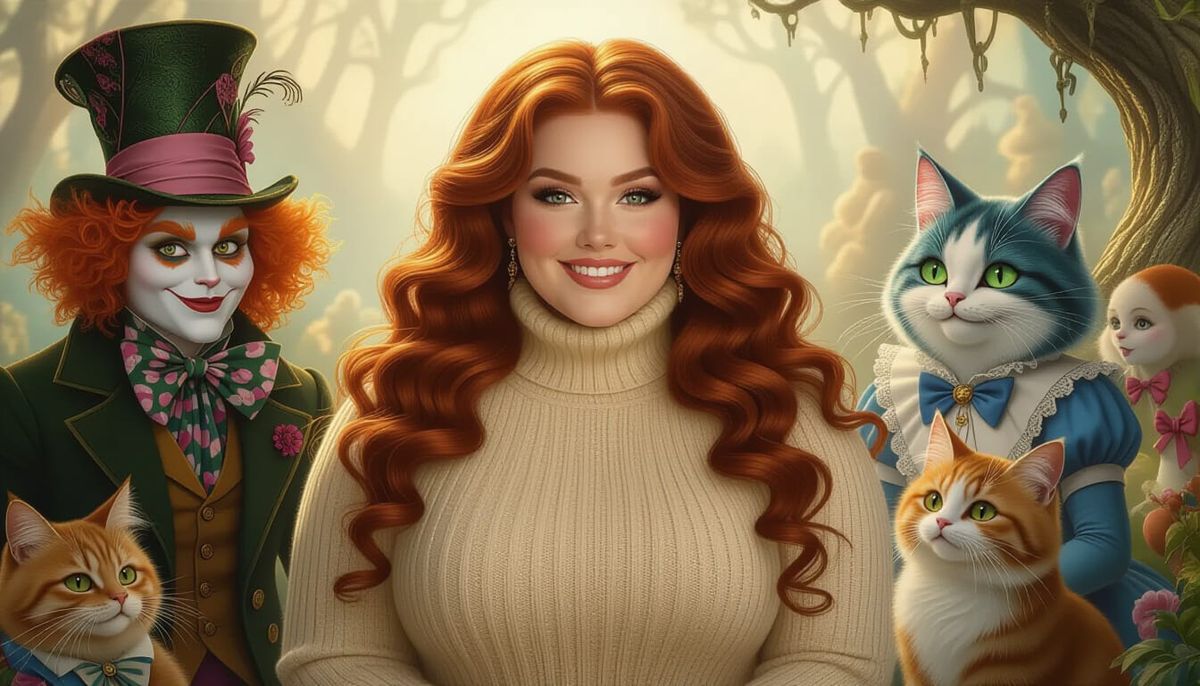 A digital painting of a smiling redhead in a cream turtleneck, celebrating with Wonderland characters. The fantasy scene features swirling mist and soft lighting, in a dreamy, idyllic style.