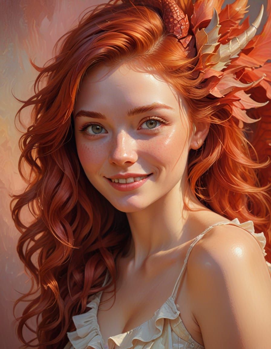 A vibrant Fauvist portrait of a smiling red-haired woman seated with her red dragon. The oil painting features soft brushstrokes, warm light, and a pastel gradient background, creating a whimsical and inviting atmosphere.