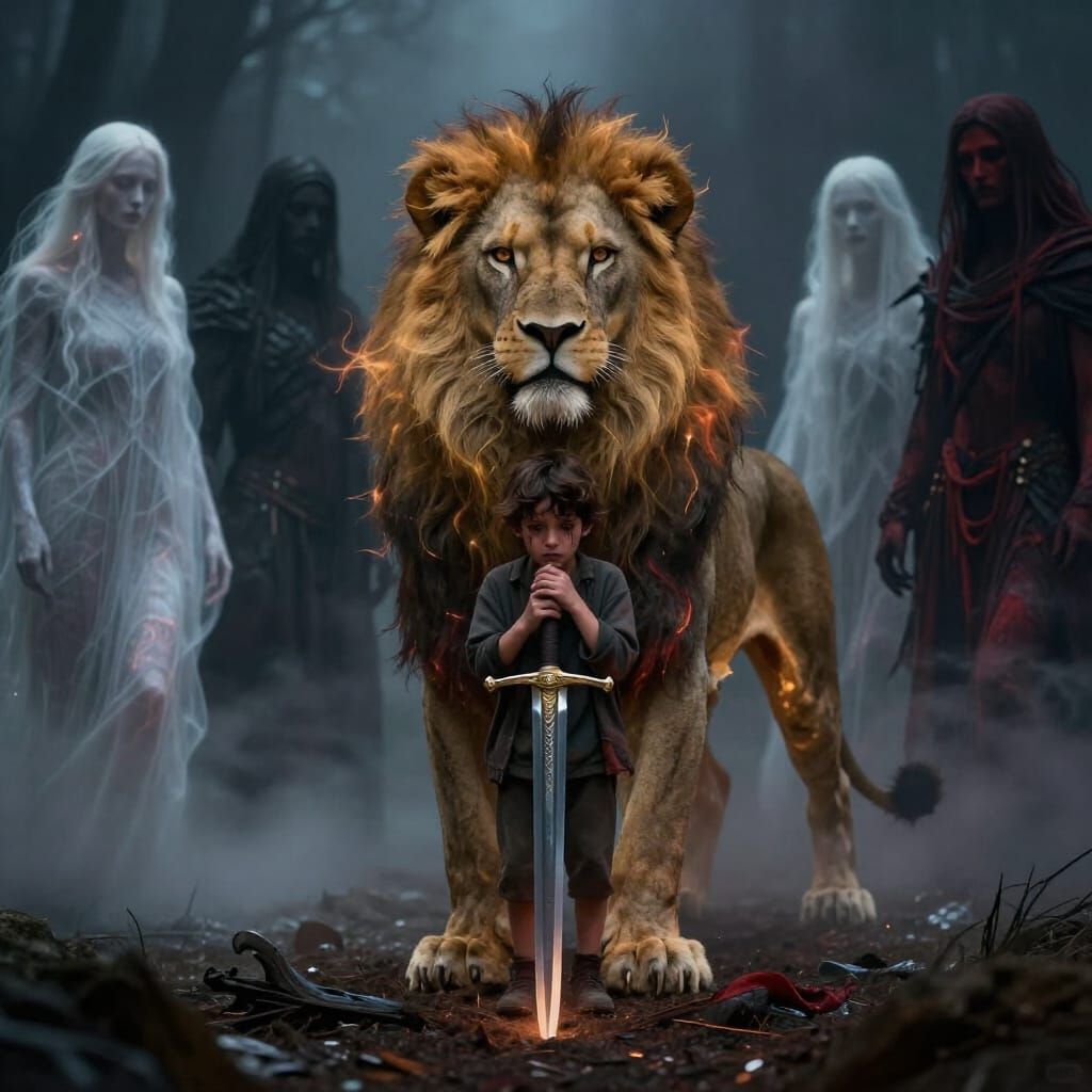 This image depicts a sorrowful boy transforming into a lion, surrounded by spectral figures and a mystical sword. Rendered in a dark fantasy style with dramatic lighting, it captures a moment of despair and rising power.