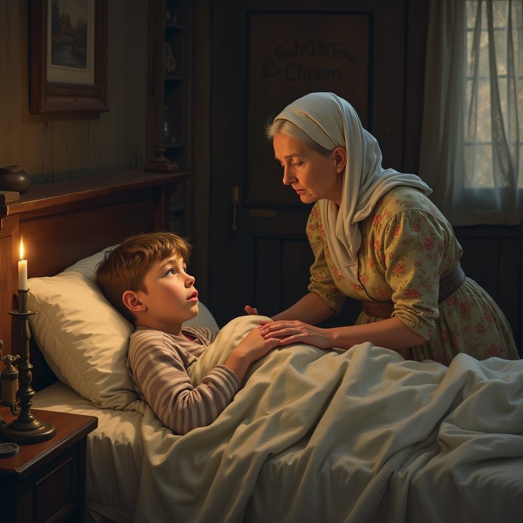 A comforting image of an elderly woman watching over a sick child. Soft candlelight fills a rustic room, reminiscent of classic American realism with a touch of warmth.