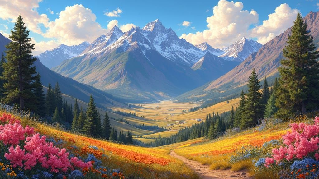 This vibrant landscape depicts Colorado's majestic mountains and lush valleys set against a patriotic backdrop of red, white, and blue, with touches of whimsy and celebratory flair, reminiscent of traditional American art and illustration styles.