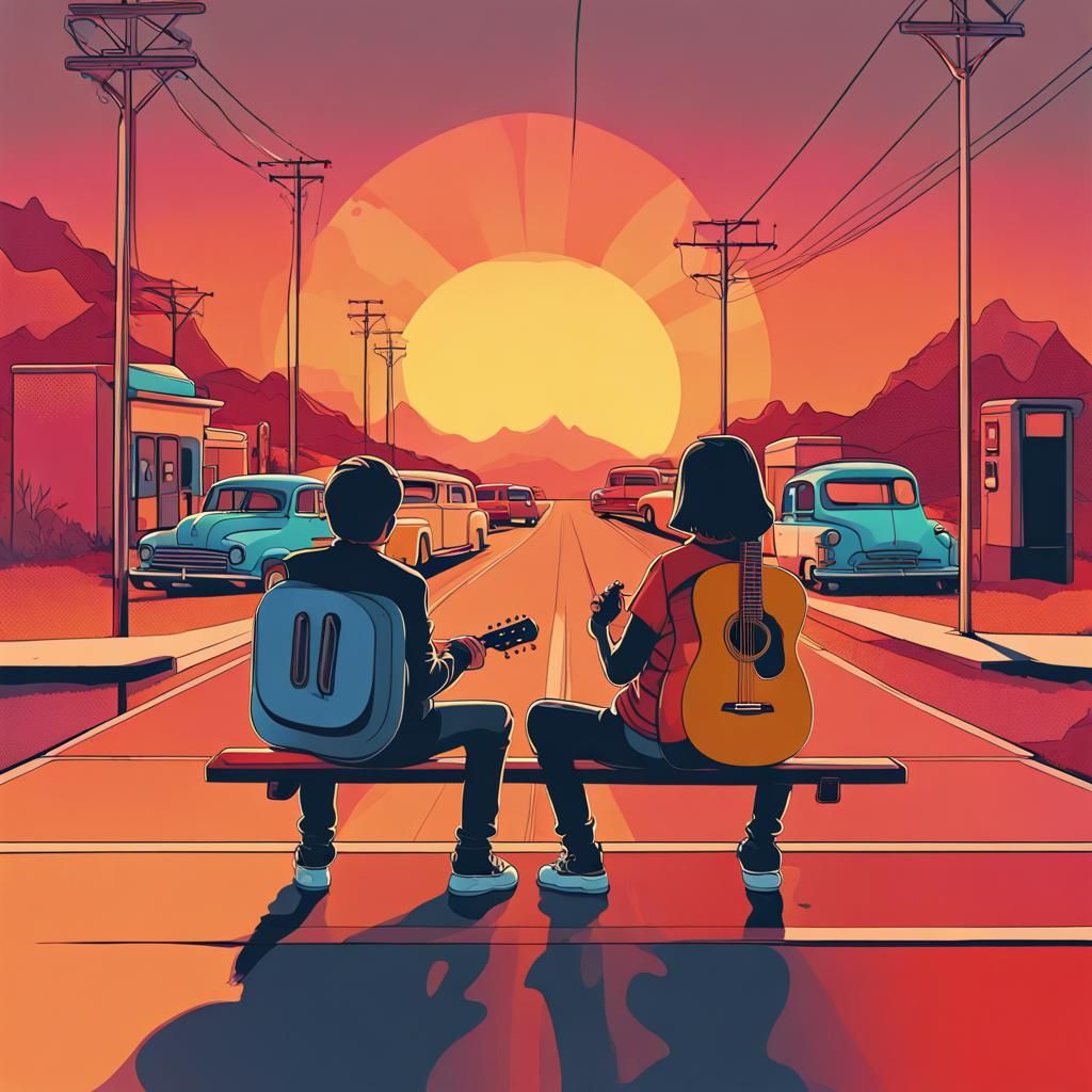 This image shows a boy and girl sitting on Route 66 at sunset. The scene includes a tent, guitar, pet, car, and gas station, rendered as vibrant pop art with geometric elements.