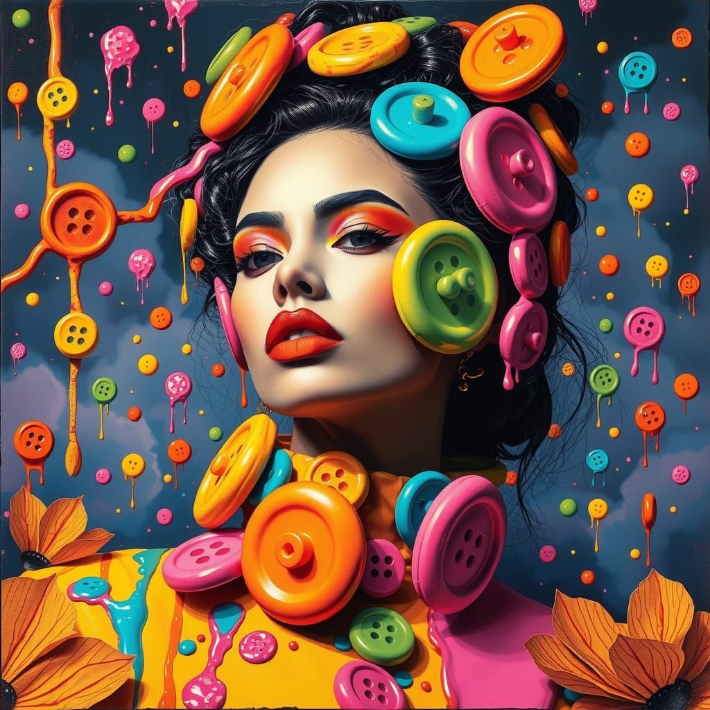 This image showcases a fashion model in a surreal, dreamlike setting surrounded by neon-colored buttons that blend with the environment, featuring a mix of graffiti, splash art, and street art elements with high contrast, polychromatic colors and ultra-detailed textures, evoking a sense of dynamic energy...