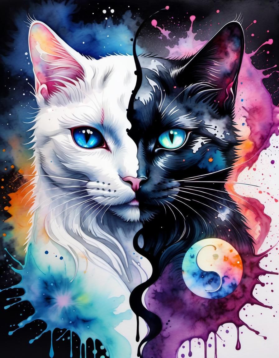 A digital rendering of a yin and yang symbol formed by a black cat and a white cat, set against an aurora background. The artwork showcases fluid painting and calligraphy elements, with dramatic flows.
