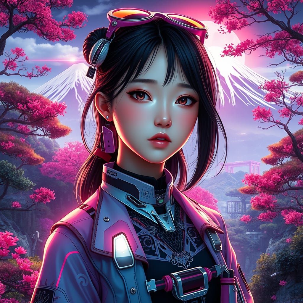 This stunning portrait captures a beautiful Japanese high school student surrounded by a futuristic Mount Fuji landscape, blending traditional culture with cutting-edge innovation and vibrant neon colors.