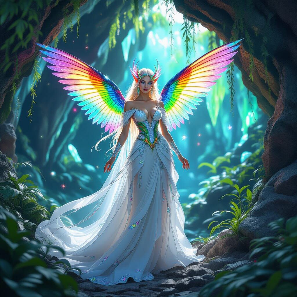 This image shows an elven goddess with hummingbird wings in a crystal cave. She wears an elaborate gown and is surrounded by lush plants, depicted with vibrant colors and intricate details in a digital painting.