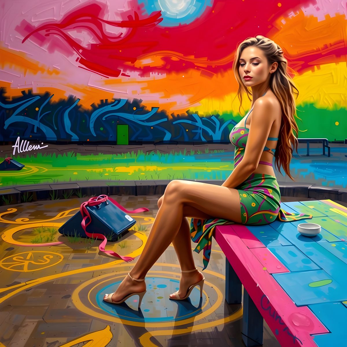 This image shows a woman with auburn hair in a green dress sitting on a wooden bench. Sunlight creates dappled patterns, highlighting her with a golden aura in an oil painting style.