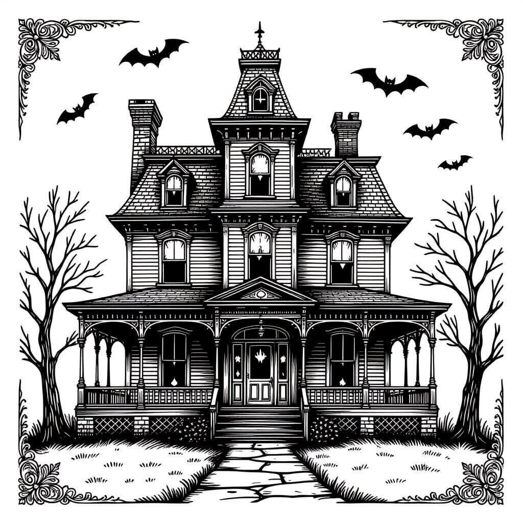 Generate free, detailed black and white line drawings like this haunted house easily. Perfect for coloring!