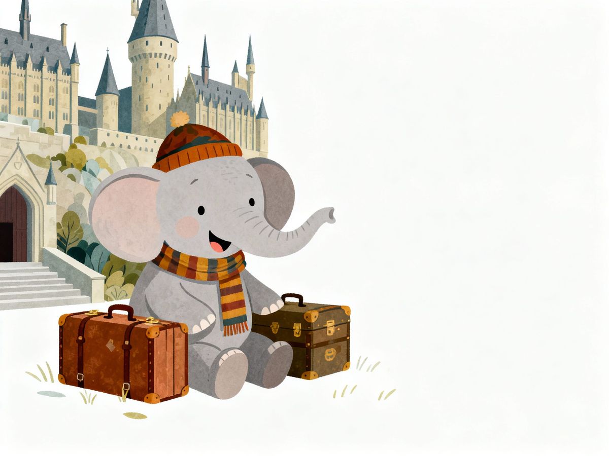 A charming illustration of a joyful elephant in a hat and scarf, seated with old-fashioned luggage near Hogwarts. Features a desaturated, light, and airy pastel color palette suitable for nursery art.