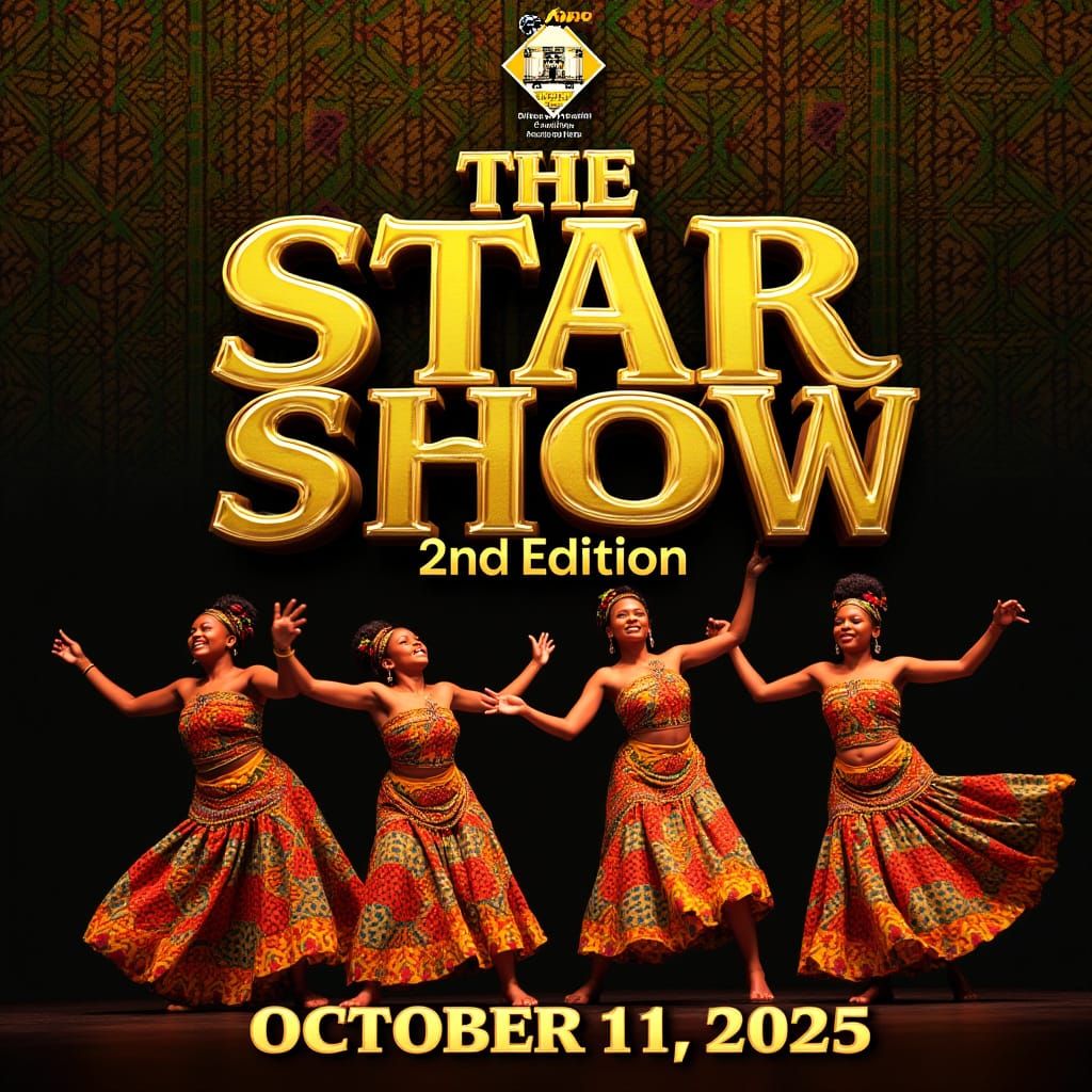 This image is a vibrant poster for the "The Star Show - 2nd Edition" dance contest in Caia Village, featuring Kente patterns and energetic dancers in traditional attire. Authentic African art style.