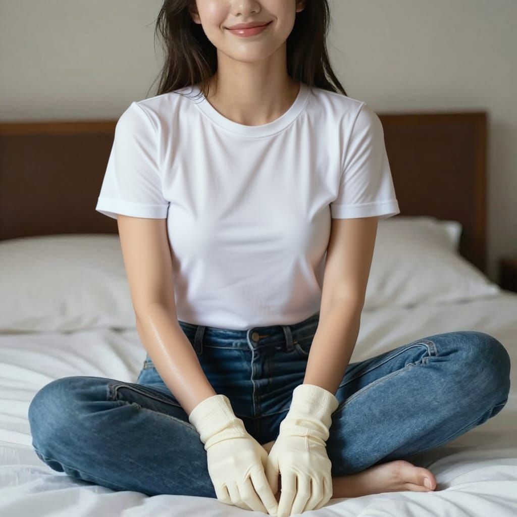 This image shows a realistic, high-definition portrait of a young woman relaxing on a bed. The image emphasizes clear detail and a silky skin texture.