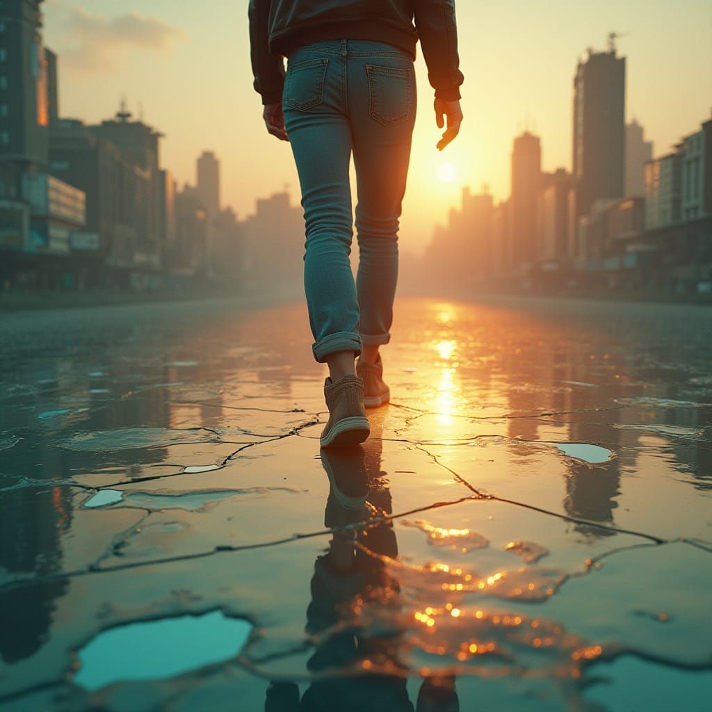 A surreal image of a lone figure walking on a fractured glass sky. Alternate realities reflect below, illuminated by cinematic golden light and deep shadows in a surreal style.