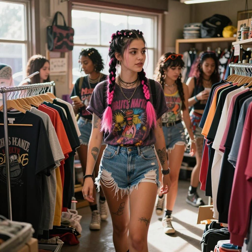 This image depicts a punk surfer girl browsing a lively, cluttered thrift store. Sunlight streams through dusty windows, highlighting vintage clothing racks in a vibrant, chaotic scene.